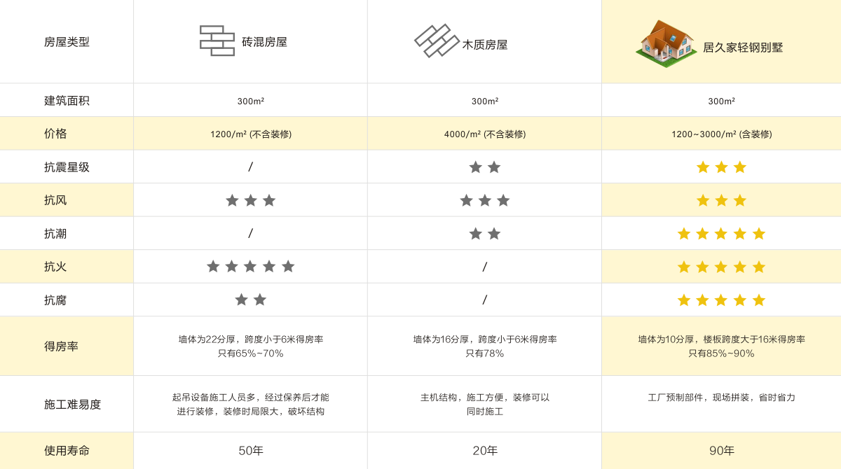 四川輕鋼別墅工廠生產(chǎn)現(xiàn)場組裝及標準化的成 本控制。同樣大小的房子,居久家 輕鋼房屋多出5%~13%的使用面積